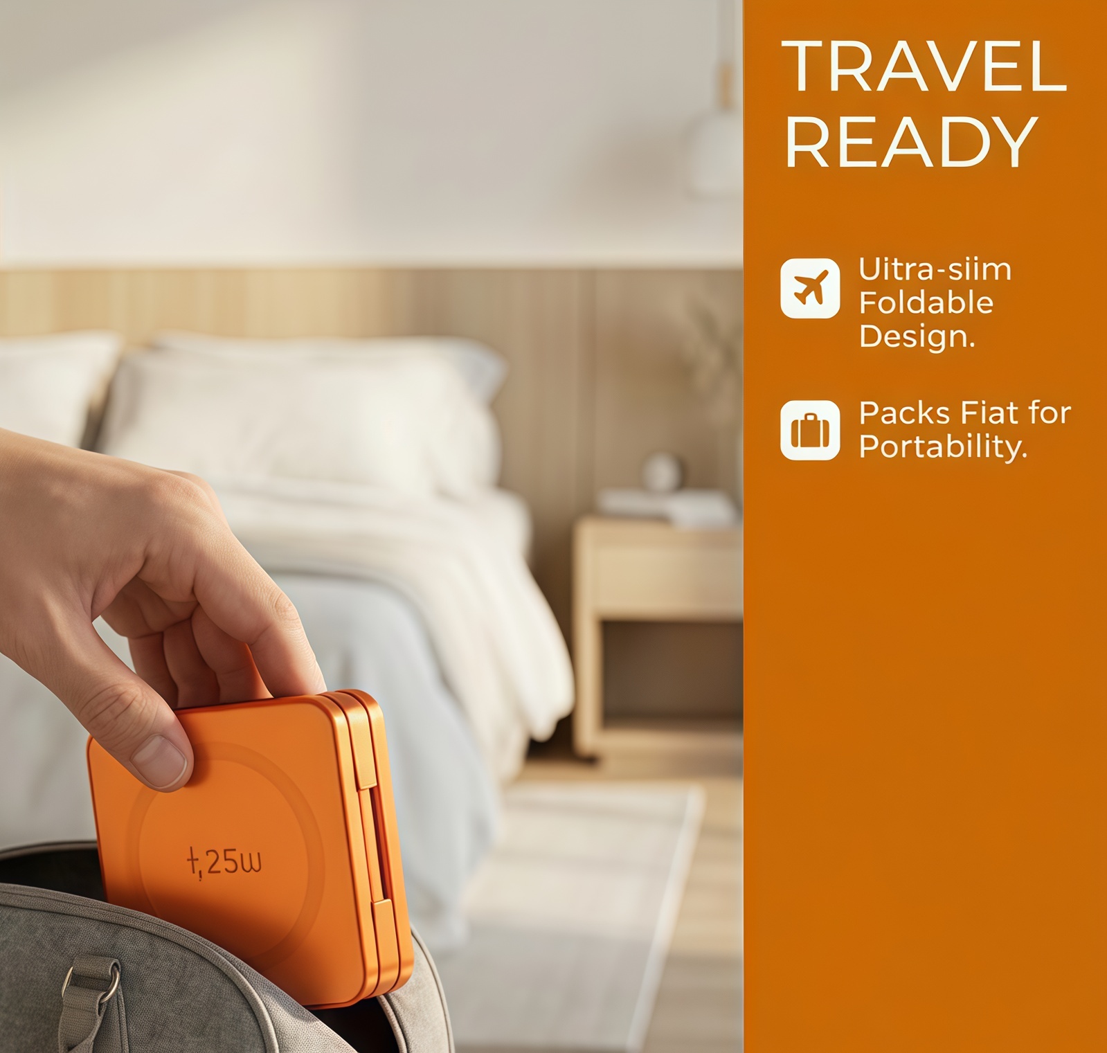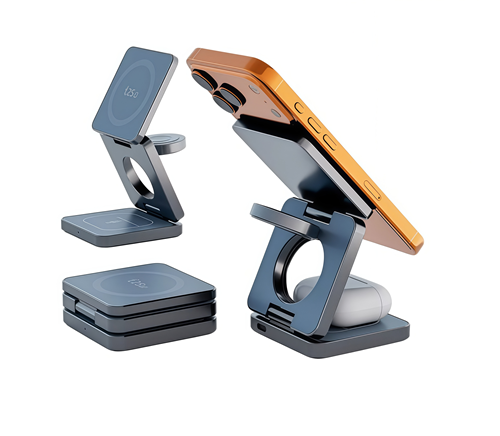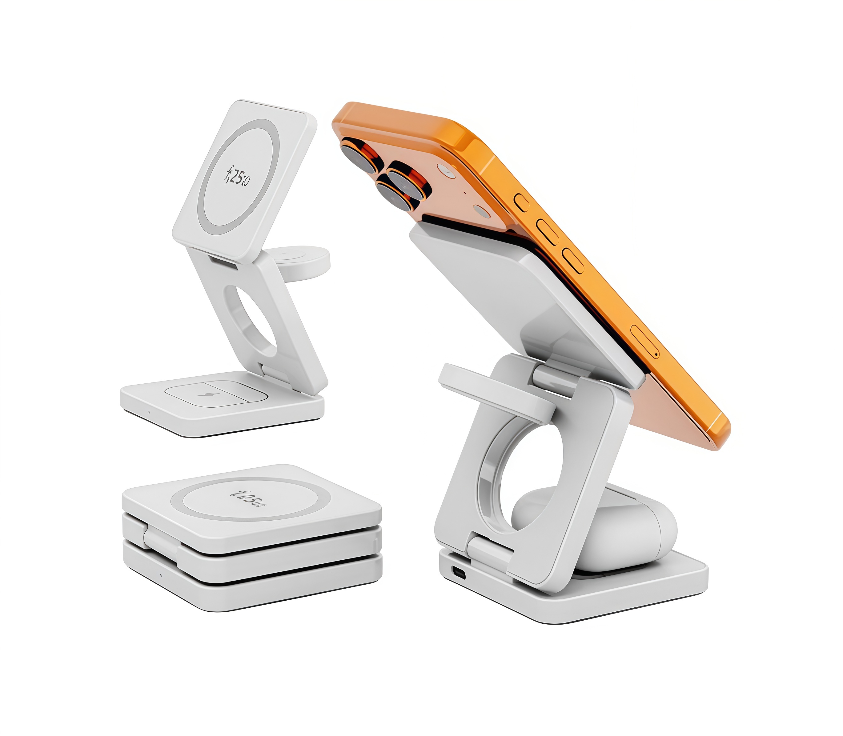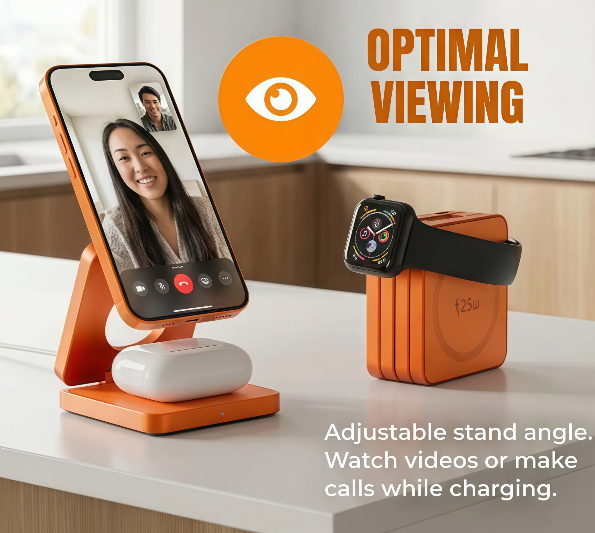 Next-Gen Qi2.2 25W Fast Charging: Unlock ultra-fast wireless charging for your iPhone. Featuring the latest Qi2.2 technology, this charger delivers up to 25W of power (iOS 26+ required), charging the iPhone 17 Pro up to 56% in just 27 minutes—up to 5× faster than standard wireless chargers. (Supports Qi2.2 25W for iPhone 17/16 series; 20W for iPhone 17 Air.) 3-in-1 Simultaneous Ultra-Fast Charging: Charge your iPhone, AirPods, and Apple Watch simultaneously with ease. Enjoy fast charging for your iPhone while powering your AirPods and Apple Watch at up to 5W wireless charging. The included 45W GaN adapter ensures optimal efficiency across all three devices. Note: Power is intelligently distributed during multi-device charging; single-device charging may be faster. Foldable, Ultra-Portable & Adjustable: Folds down to one-third the size of an iPhone 16 Pro Max and weighs just 5.23 oz—perfect for travel. The triple-axis hinge features sturdy damping for enhanced stability. Slight stiffness during first use is normal; adjust gently for smoother operation. Easily switch between flat and stand modes for both portrait and landscape viewing. Strong Magnetic Alignment: Equipped with 16 powerful N52 magnets, ensuring precise alignment and a secure hold for your iPhone. Easily attach or detach your device with one hand for a seamless charging experience. Compatible with magnetic cases. For better heat management, using the charger without a case is recommended. Wide Compatibility: Qi2.2 25W: iPhone 17/16 series, Pixel 10 Pro XL Qi2.2 20W: iPhone 17 Air Qi2 15W: iPhone 12–15 series, Pixel 10 series Up to 5W: Apple Watch Ultra 3/2/Ultra, Series 1–11, SE (3rd/2nd/1st) AirPods: Pro 3 / Pro 2 / Pro / 4 (ANC) / 3rd / 2nd generation with wireless charging case Note: The AirPods charging area is non-magnetic—please align within the marked charging zone. 360 Degree Rotation, Foldable, with magnetic wireless charging