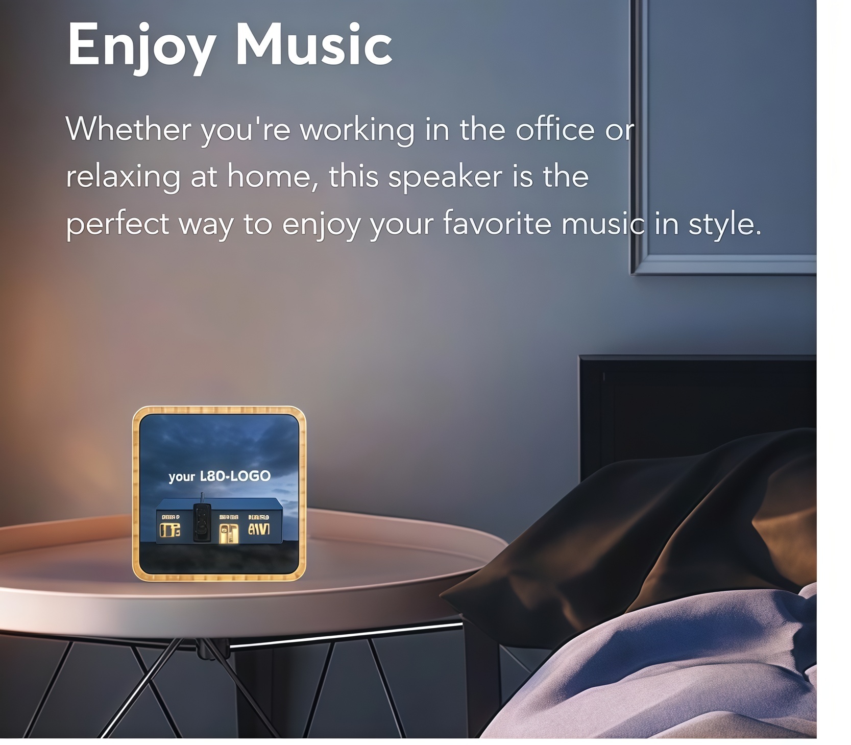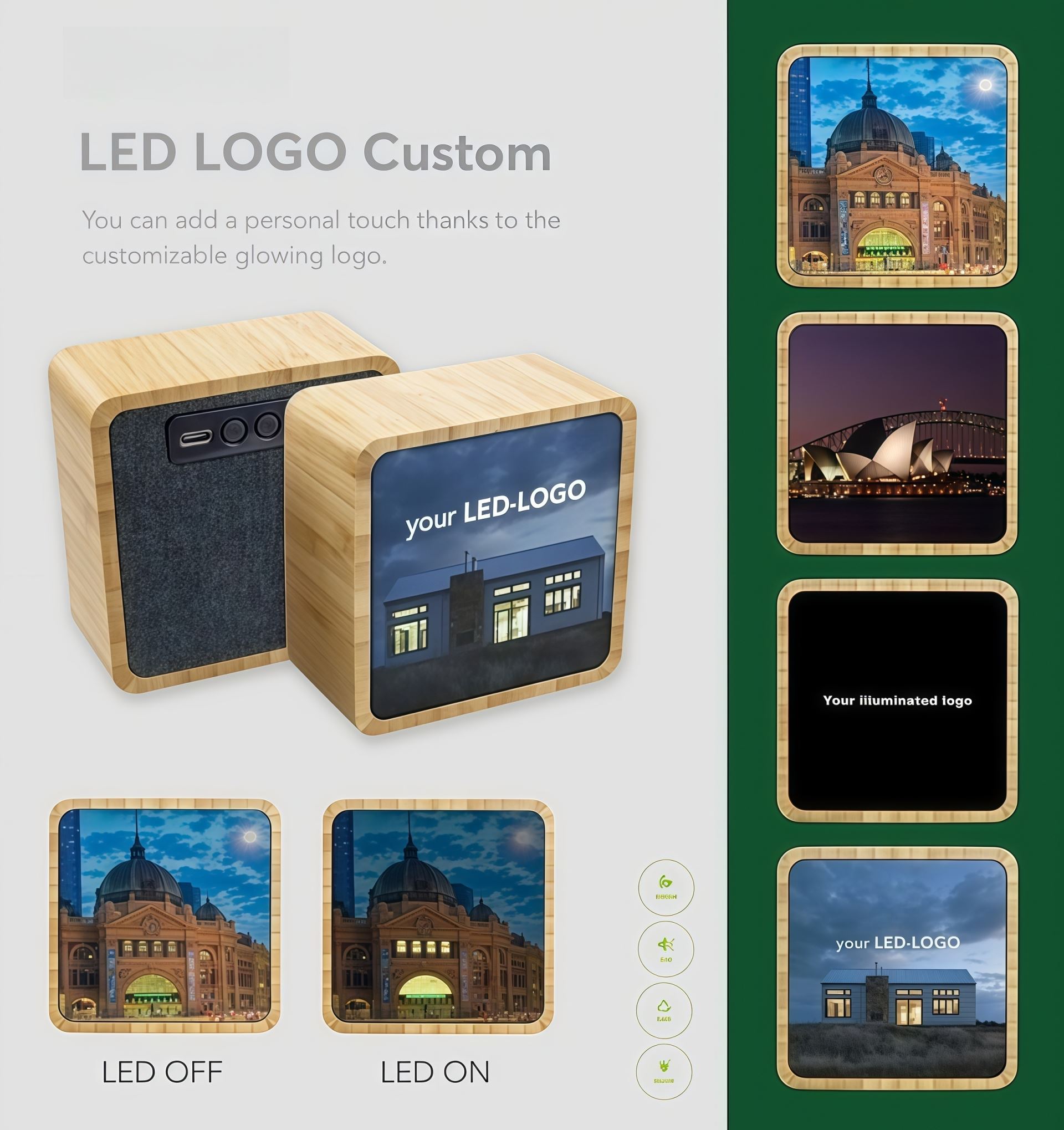 Your logo takes center stage — printed in photo-realistic quality across the entire front panel and beautifully illuminated from behind when the speaker is in use. Bright areas of your design truly come to life, ensuring your branding gets noticed.