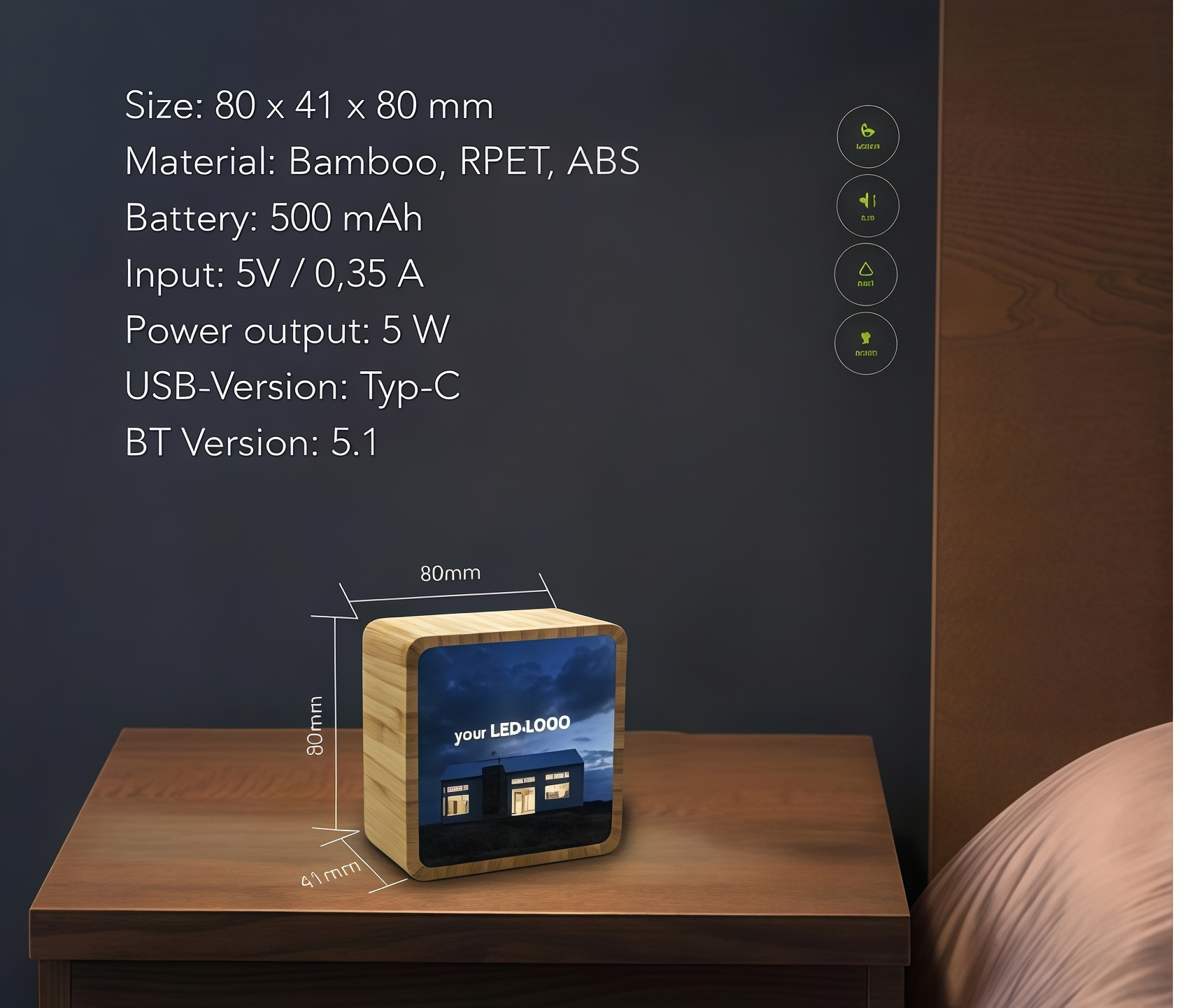 Rechargeable via USB Type-C (charging cable included), this speaker combines cutting-edge performance with eye-catching illumination — the perfect blend of technology and advertising impact.