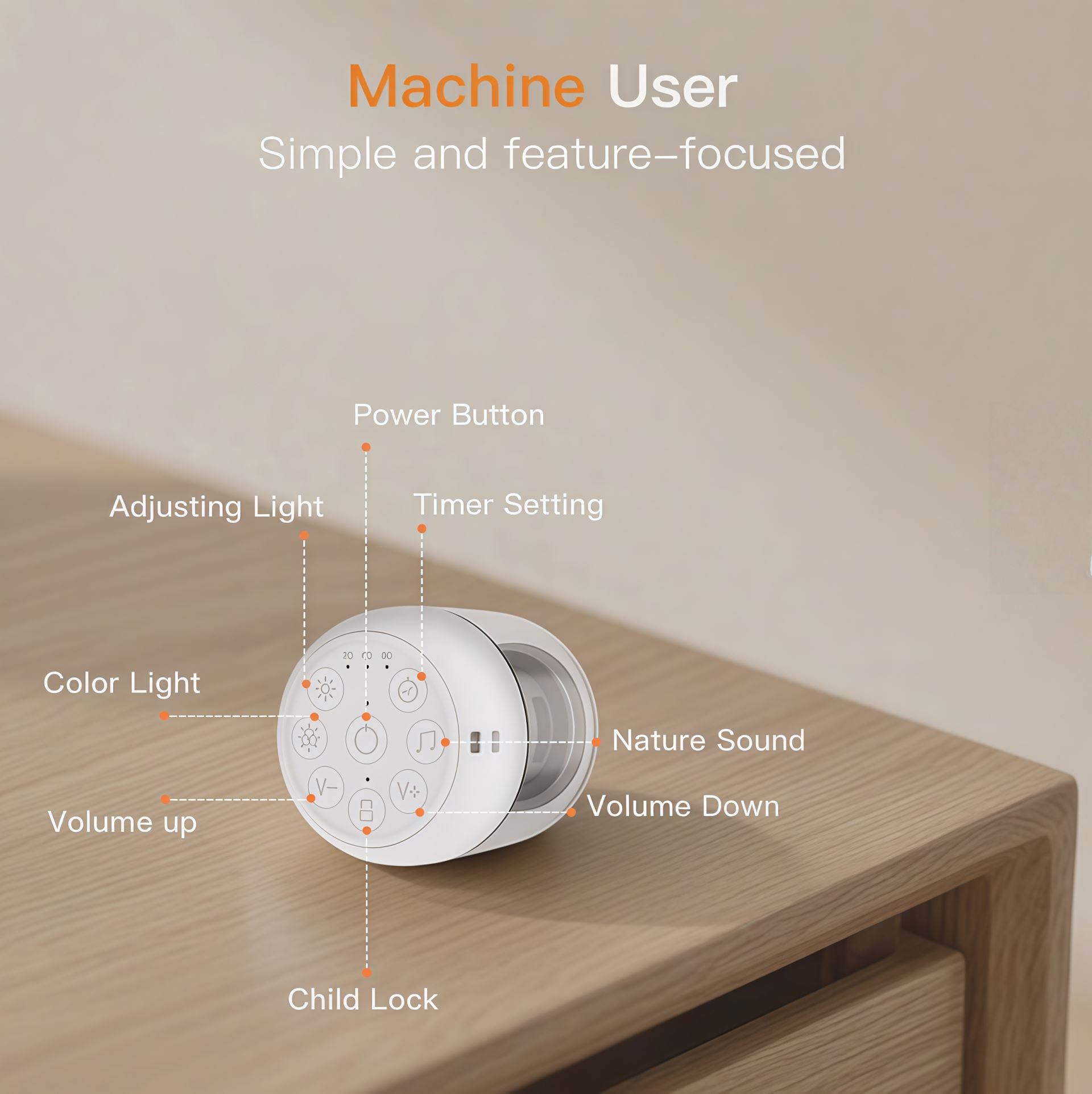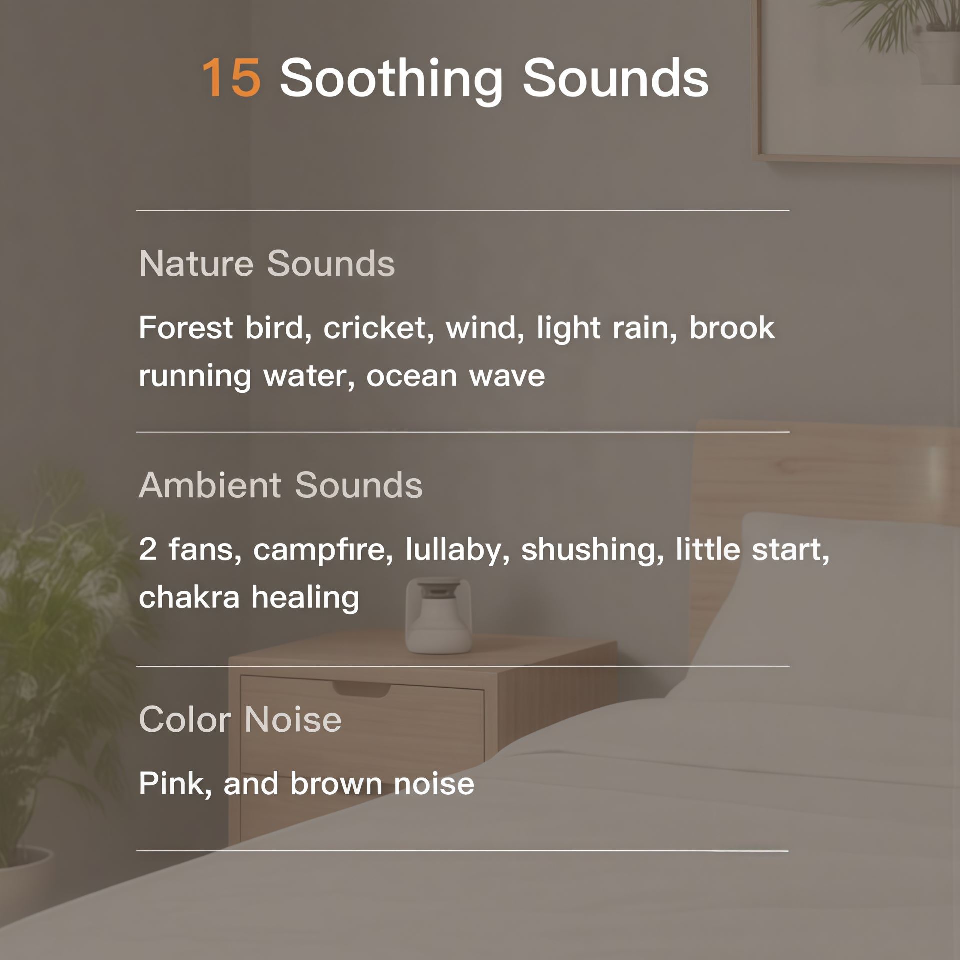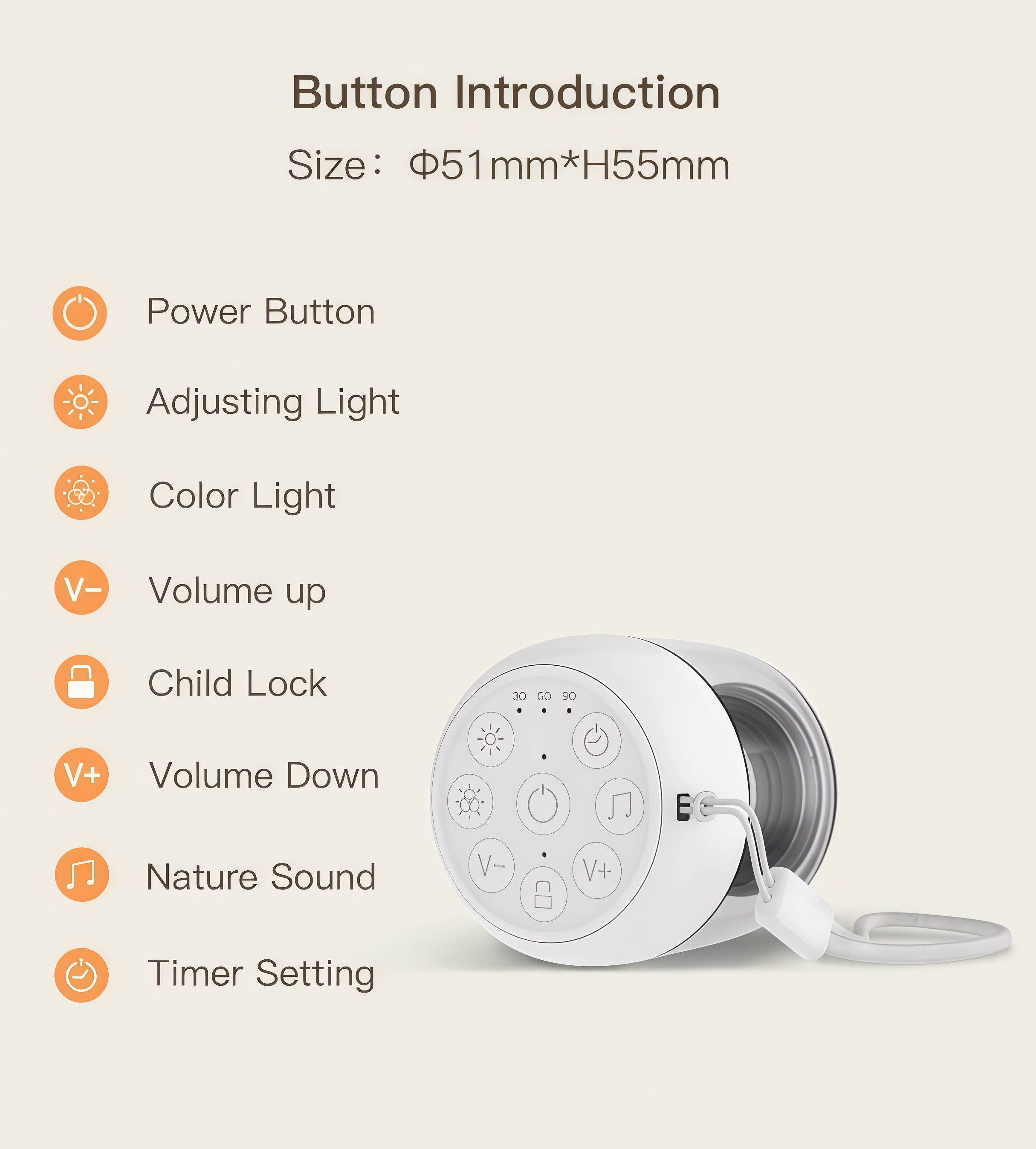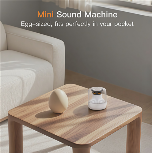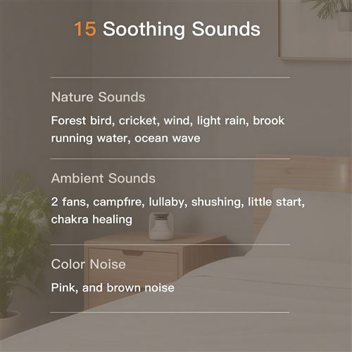 Portable Sound Machine combines 15 soothing sounds, adjustable brightness night light, and a compact design for sleep and relaxation. Certified with CE, FCC, and RoHS, ensuring compliance with international safety and environmental standards, providing market access assurance. With a battery life of up to 7 hours, Type-C charging, and support for customization. Battery Capacity 3.7V 500mA Timer Setting: 30/60/90min Auto Shut Off Work / Charging Time: 7Hours / 2Hous Interface: Type-C Charging Port, Compatible with PD fast charging + overvoltage protection